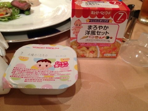 ☆離乳食110日目☆■1回目■・まろやか洋風セット(BF):野菜ときのこのリゾット60g+かぼちゃサラダ60g・くだもの食べよっ!4種のくだもの:60g---------------------------------------------total 180g披露宴中にもぐもぐ…これ+出されてたバゲットの中身だけとかも食べてました。よく食べるなホントに…。それにしても眠そう(笑)■2回目■・雑炊とうどんのセット(BF):たら雑炊60g+煮込みうどん60g・フルーツヨーグルト(BF):70g---------------------------------------------total 190gもつ鍋屋さんにて。座敷だったからウロウロして大変...