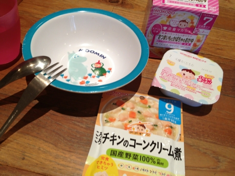☆離乳食111日目☆■1回目■・さつまいもとかぼちゃのお粥(BF):80g・ころころチキンのコーンクリーム煮(BF):70g・くだもの食べよっ!4種のくだもの(BF):60g・水---------------------------------------------total 210gムーミンカフェにて。お皿貸してもらったらめーっちゃくちゃ可愛いムーミンのお皿でした(^-^)ニョロニョロスプーンも貸してくれたので試しにこれであげてみたらふつーに食べてた…。しかも結構あげやすいし可愛いし、買って帰りたかった…ニョロニョロスプーン(とフォーク)。お会計時に混んでたので断念してしまいましたが...
