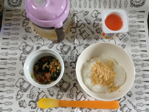 ☆離乳食109日目☆■1回目■・きな粉粥:小さじ14(6倍粥12+きな粉2)・小松菜とにんじんのツナ和え:小さじ7(小松菜3+にんじん3+ツナ1)・ベビーダノン(にんじんとりんご):1個・麦茶---------------------------------------------total 小さじ26 (140g)午後から出るので急いで作った&食べさせた感じ…。お口の周りがえらいことなってますが…(笑)■2回目■・鶏とおさかなのベビーランチ(やわらか鶏のおかゆ+白身魚と野菜の洋風煮込み):80g×2・イオン飲料-------------------------------------------------total 160g夜は外出だったのでベ...