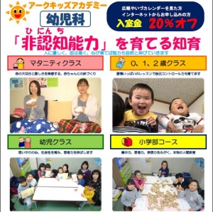 JUGEMテーマ:幼児教育 幼児科入室金20%オフ! 4月からの新しい季節、新しい生活にも慣れてきた頃でしょうか。 なにか新しい事を始めてみようかな?とお考えの方、アークキッズアカデミーの無料体験レッスンはいかがでしょう。 アークキッズアカデミーは『非認知能力を育てる知育』を行っています。 非認知能力・・・新聞やテレビ番組などどこかで聞いた事がある方もいるのではないでしょうか。 非認知能力とは、学びに向かう姿勢(目標・意欲・粘り強さ)や、学力で測れない協調性・忍...