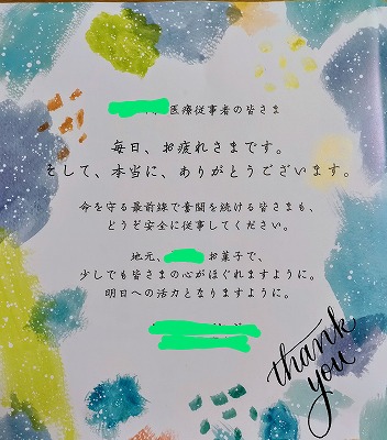 JUGEMテーマ:幼児教育 こんにちは!ぴゅりずみーあです♪ 緊急事態宣言が出て2週間ですが 変異種も心配され、また違ったフェーズに なった感じもします 年が明けてからの保育園へ出勤した際 県からの感謝の品を頂きました 中にこのようなメッセージが入っていて 逆に、ありがとうございますという気持ちでした 最前線で仕事をしている職種ではありませんが 福祉関係の仕事ということで お心遣いをいただいているのだと感じます これだ...