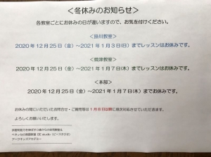JUGEMテーマ:幼児教育 こんにちは。 アークキッズアカデミーです。 冬休みのお知らせです。 各教室ごとにお休みの日が違いますので、お気を付けください。 <掛川教室> 2020年12月25日(金)〜2021年1月3日(日)までレッスンはお休みです。 <焼津教室> 2020年12月25日(金)〜2021年1月7日(木)までレッスンはお休みです。 <本部> 2020年12月25日(金)〜2021年1月7日(木)までお休みです。 お休みの間にいただいたお問合せ・ご質問等は1月8...