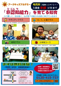 JUGEMテーマ:幼児教育 幼児科入室金『半額』キャンペーン実施中! 〜2020年3月20(金)まで〜 幼児科『春の生徒募集』のお知らせです。 この春から新しい事を始めてみよう!と思っているかた、 アークキッズアカデミーの無料体験レッスンはいかがでしょう。 『非認知能力を育てる知育』 非認知能力とは、学びに向かう姿勢(目標・意欲・粘り強さ)や、学力で測れない協調性・忍耐力・心の健康。 つまり『生きるためのスキル』生きる力のこと! 人に優しく、志は高く 心が育てば、...