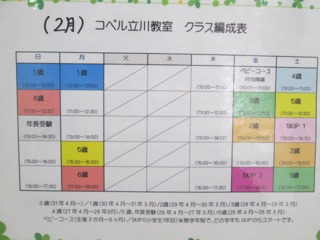 JUGEMテーマ:教育 JUGEMテーマ:幼児教育 こんにちは! 立川教室のおぎわらです(*^^*) 立川教室のママの声の最新がアップされました!こちらから☆ 今日から2月です! 年明けてあっという間の1か月でした! インフルエンザなど流行っていますが、気を付けてくださいね! ちなみに現在新学年キャンペーン中です!!! 体験レッスンお待ちしております! 2月の時間割はこちら! 今月のベビーコース開催日時は2月7日(金)です! 準...