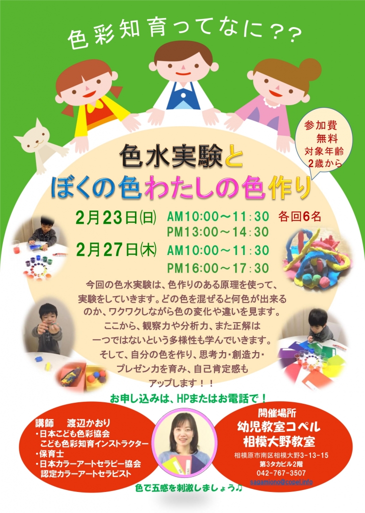 こんにちは😀 コペル相模大野教室です。 寒い日が続きますが、みなさまお元気にお過ごしですか❓ ⭐教室主催のイベント のご案内をいたします⭐ 「色水実験とぼくの 色わたしの色作り」 今回のイベントは色彩知育の先生をお招きしての特別なものとなっております。 色水実験や、紙粘土を使った制作等の色彩ワークを通して、色と言葉がけの効果を体感できます。 コペル...