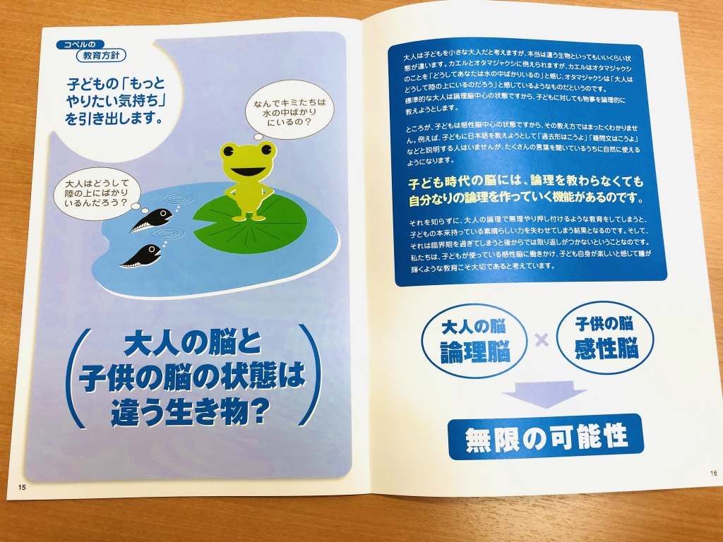 JUGEMテーマ:幼児教育 こんにちは。八王子市の幼児教室コペル八王子中央教室です。 コペルのパンフレットから教育方針の一つをご紹介します。 大人は子どもを小さな大人だと考えますが、本当は違う生物といってもいいくらい状態が違います。脳の状態からするとカエルとオタマジャクシに例えられますが、カエルはオタマジャクシのことを「どうしてあなたは水の中ばかりいるの」と感じ、オタマジャクシは「大人はどうして陸の上にいるのだろう」と感じているようなものだというのです。 大人は論理脳を使ってい...