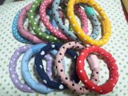 JUGEMテーマ:知育玩具 大好きな手芸を通じてボランティアを考えています。 子供向きの「 知育玩具 」を中心に。 テーマは「 指先の動き 」です。 ( つまんだり・持ったり・ヒモに通したり・積んだり ) いろんな遊びに対応できる手作りの「 輪 」を追加制作中。 材料は、布・カバン用の手芯・刺繍糸。 手芯に布を巻き縫いしたものをいろいろ用意。 作り方のポイントは、両端を縫い繋ぐとき。 縫い代は、最初はフェルトを使って巻きましたが... 虫食いが発生して、少しあわてました。 今は、同...