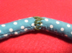 JUGEMテーマ:知育玩具 グループ活動でもなく、ささやかな個人活動なので... 周囲からの理解度が低くくて... でも、プレゼント活動は続けたくて手作り作品を増やしています。 布と、カバンの持ち手に使う手芯、刺繍糸を材料に「 小さい輪 」を手作りしました。 テーマは「 指先の動き 」です。 指を立てて、輪を通していく遊びです。 幼い、小さい指には、何個通せるでしょう ? 人差し指では ? 自分の指・友達の指、お母さんの指・・・みんなで遊んでほしいですね