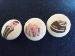 JUGEMテーマ:知育玩具 布と、ボタン製作キットで【 オリジナルボタン 】を作っています。 ボタン通しと、指先の【 知育 】を兼ねて。 これも、装飾用なので( 18mm )小型サイズです。 布地はピンクで、もようは香水瓶・ギフトボックス・お菓子と、女の子向きにしました。 左からバレーシューズ・クラウンです。 好み ? かは、ちょっと自信がありませんが、楽しく練習してほしいなと思っています。