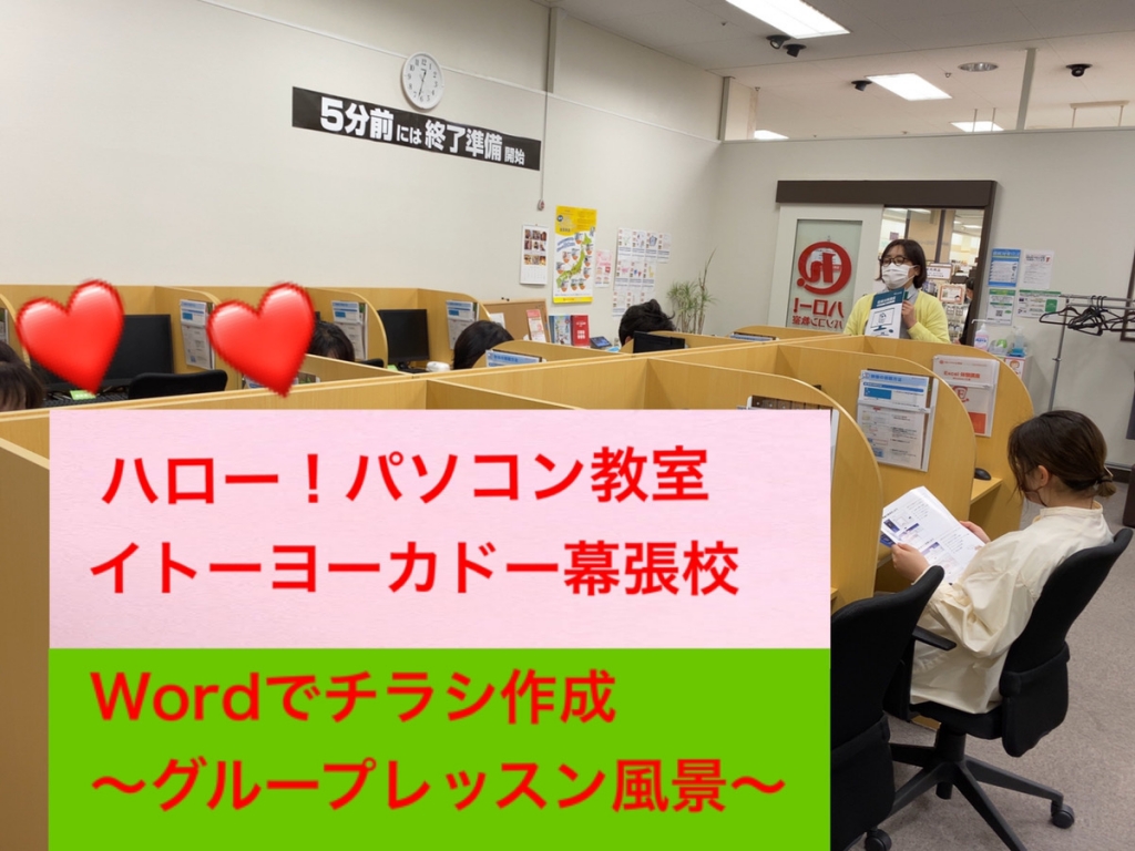 JUGEMテーマ:PTA役員・委員会 こんにちは! JR総武線「幕張駅」から徒歩10分/京成線「幕張駅」 徒歩5分の ハロー!パソコン教室 イトーヨーカドー幕張校 教室インストラクター永野です。 今日から4月! コロナ禍における2度目の入学シーズンですね。 これから新生活を送る皆様、きっともう少しで本当の春がやってくることを信じて、頑張りましょう! さて、今回は、3月に行われましたグループレッスンの様子をお知らせします! 今回のグループレッ...