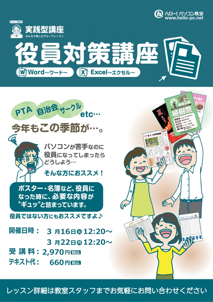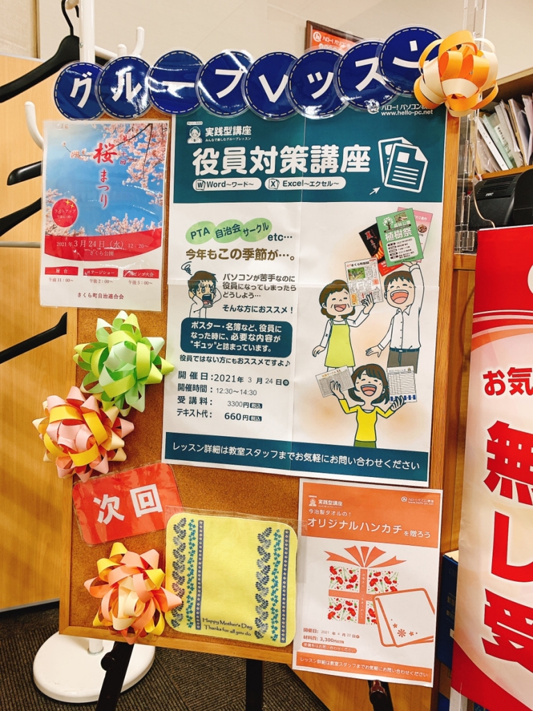 JUGEMテーマ:パソコン教室 JUGEMテーマ:マイクロソフト JUGEMテーマ:ビジネス JUGEMテーマ:PC初心者 JUGEMテーマ:PTA役員・委員会 こんにちは! 西武新宿線 田無駅 徒歩1分 田無アスタ店2階 ハロー!パソコン教室 田無アスタ校 教室インストラクターの間中です♪ 今回はハロー!パソコン教室で人気のグループレッスンについてご紹介します。 ハロー!パソコン教室では、毎月様々なテーマでグループレッスンを行っております。 普段は個別授業を行...