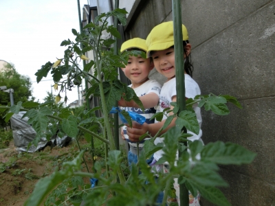 JUGEMテーマ:保育園 6/7(水) 先月、畑に植えた野菜の苗。 年長薔薇組さんが、毎日 2名ずつ当番で水遣りを しているので、元気に生長しています。 トマトが大きくなったので、添え木に固定をしました。 甘くてかわいいミニトマトにな〜れ! ミニトマトの赤ちゃんを発見!「ココにあるよ」 キュウリの赤ちゃんも発見しました。 畑の近くでよ〜く見ると、野菜の生長が分かります。 本日、関東地方でも梅雨...