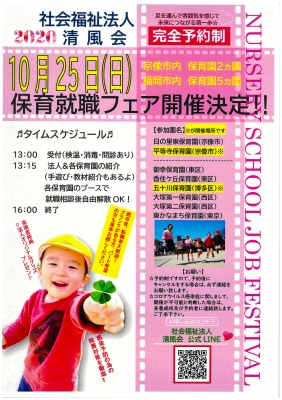 JUGEMテーマ:保育園 社会福祉法人清風会が 合同就職フェアを開催します!! 働く保育士から、保育園の魅力を 直接聞きチャンスです(*^-^*) 保育園は、市内各地にありますので、 希望の勤務地の保育園ブースで 詳しく話が聞けます♬ 新卒、既卒、正規、パート 問わず保育職をお考えの方なら どなたでも大歓迎です(#^.^#) 10/25(日) 13:00〜16:00 場...