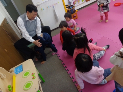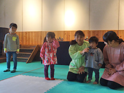 11月のお誕生児は3名でした 恥ずかしがりながらも、上手に自己紹介や質問に答えてくれました。 どの子も、あっという間に大きくなりますね 先生の出し物は、子猫のミャーとネズミのチューのお話。 ネズミのチューが色々な発見をするお話でした。 ミャーの形が色んなものに変わり、子ども達は大喜びでした