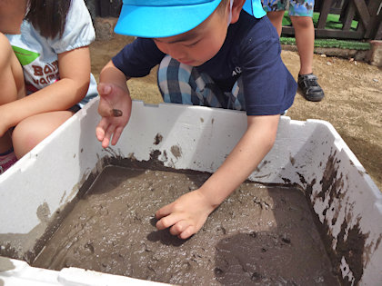 夏に稲のタネを植えました。 第一関節まで穴をあけて、そこに埋めていきます。 秋になり、大きく育った稲を刈ります。 とても楽しそうに刈っていました。 その後、収穫した稲穂から米粒を取り出しました。 お米は焚いて、おにぎりにして食べました。 お米作りの大変さを、少し感じることが出来たようです。
