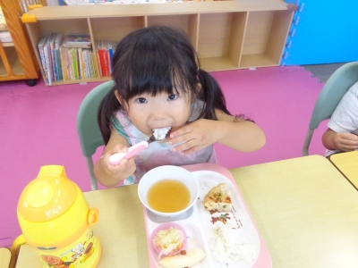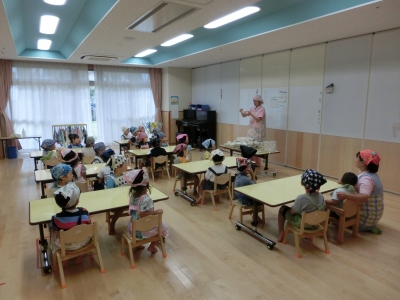 年中・年長児が育ててきた夏野菜も終わりの時期になりました。給食の先生が最後の収穫物を使って、美味しいピザの作り方を教えてくれました 一つ一つ説明しながら、目の前で作ってくれました。 その様子を見つめる子ども達の目は真剣です。 下ごしらえが出来たら、今度はオーブントースターを使って目の前で焼きます。子ども達は興味津々でした。 自分たちが一生懸命水やりをして育てた野菜を自分たちで収穫し、どんな風に調理されるのか実際に見ることができてとても勉強になったと思います。 ...