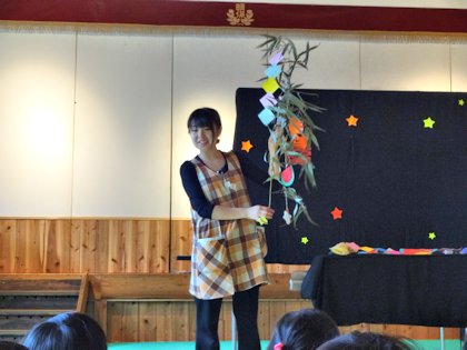7月7日、『七夕まつり』を行いました みんなで作った笹飾りの説明や、七夕の由来を聞きました。 笹飾りにも、一つ一つ意味があることを知りました。 織姫と彦星のお話を、ブラックシアターで見ました。 暗い中で光る織姫や彦星をジーッと見つめていました。 そして、みんなの願い事が書いてある短冊を燃やしました 短冊に書いた願いごとが叶うよう、手を合わせてお祈りしました