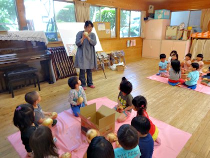 5月のお誕生児は6名でした . 自己紹介や質問に上手に答えていました。 . 「好きな乗り物は?」と聞かれて、 「新幹線」「ママの車」と、答えていました。 . 先生の出し物は、‟落ちた落ちたゲーム” . 「りんご」「カミナリ」「げんこつ」と、 出された絵に合わせて、手を動かす位置が変わります。 . みんなとても楽しんでいました