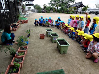 4・5才児が夏野菜の苗を植えました。 5才児は、ナス・ピーマンとグリーンカーテン用の朝顔を、 4才児は、トマト・オクラを植えました。 「トマトの匂いがする〜」etc、色んな発見をしながら作業をして いきました。 苗の入っているカップからそ〜っと苗を取り出し、土を少しほぐし て植えていきます。 「ここらへんに、うえる?」「ちかくじゃーいけんよ!」と、自分 たちで意見を出し合い協力しながら植えていきました。 仕上げは‟水やり” 「そーっと、かけてあげんと!」 優しく水やり...