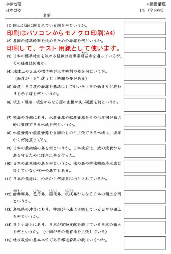 中学地理の教科書の太字(重要語句)を一問一答のドリル形式にしました。 是非、ご覧下さい。 時空先生のドリルプリント JUGEMテーマ:家庭学習