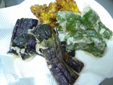 先日の食事会ナス科での余り食材で。 と言っても 茄子と言ったら天ぷら!って真っ先に出てきそうなのに、 本番メニューには登場せず。 茄子の天ぷらが食べたくて、作りました。 天つゆとおろし生姜で。 茄子の天ぷらは、 茄子を切ったら水を張ったボールに入れて しばしあく抜きを。 それと同時に切り込みから開いて扇の形になります。 そうすると、衣もつけやすく、揚がりやすくなります。 ナス科の茄子とピーマン。 オマケはスイートコーンのかき揚げ。 コーンの甘みが増して、大好きです。 残った衣...