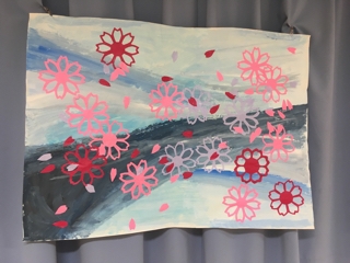学童クラブの中で和太鼓クラブの演奏を発表する時に、 この太鼓クラブの子たちはとっても器用でやる気のある子たちばかりなので 太鼓の練習だけでなく 舞台の装飾も、自分たちで準備しようということになりました。 1つは背景。舞台の後ろの壁です。 模造紙に絵の具で色を塗って、お花の形に切った折り紙を貼りました。 バックの色は青、白、黒、の絵の具を大きいトレイに出して、 黒の多い青、白の多い青、とまだらに混ぜ、 みんなで好きな部分の色を使って、ハケで塗ってもらいました。 塗る前に模造紙に鉛筆で「...