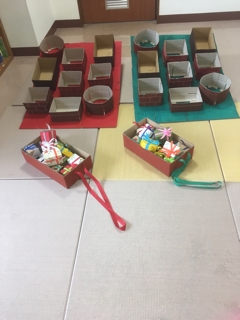 児童館、学童、保育園のクリスマスに、こんなあそびはいかがでしょう。 サンタクロース修行の1つとして 煙突にプレゼントを投げ入れるミッションです。 えんとつは全てダンボール製。 あり物の段ボールを正方形、長方形や円の煙突にして、アクリル絵の具で色を塗りました。 ベースの段ボールには、ボンドで貼り付けてあります。 入れやすいように、少し傾斜をつけています。(この部分も段ボール) 投げるプレゼントは、ほとんど牛乳パック。 牛乳パックの底面が、一辺10センチな...