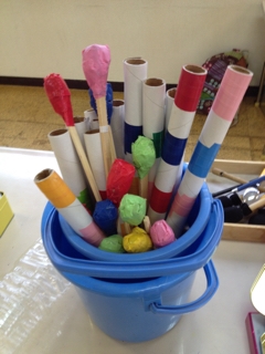 ストンプパレード本番を目前に控えた今日の練習。 先生方が素敵な楽器を用意してくれました。 デッキブラシとほうきに加えて、 バケツと一斗缶、 そして、先に鈴とキラキラテープのついた木のスティック。 木刀くらいの太さです。長さは、デッキブラシと同じくらいです。 鈴は、幼児さん用の楽器の鈴だそうです。 これが大人気で、だんだん飽きてきた子どもたちのテンションUP! 集まった子たちから好きな楽器を持って、 勝手に練習し始めました 聞いてると…お、できてるできてる。 ずごいぞ。 そこに...
