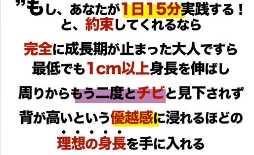 JUGEMテーマ:身長を伸ばそう! もしも、あなたが『もうチビとバカにされるのは嫌だ』 『身長を伸ばして周りを見返してやりたい』と思うのであれば、 5分だけこの手紙を読んでみて下さい。 ヨガの功績を称えられ日本人初のアメリカ永住権を取得したヨガの第一人者が、 「完全に成長期が止まった大人でも身長が伸びる方法」を、初公開します! 信じられないかもしれませんが、 成長期を過ぎた大人がサプリメントや変な器具を付ける事なく 骨を伸ばす手術もせずに90日間で5cm...