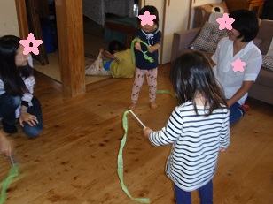 JUGEMテーマ:子育て支援 2014年に 初めてお会いした 新米ママと赤ちゃんだった皆さん 1週間 2週間 1カ月 半年と 大切に毎日を一緒に過ごしてきた皆さん その赤ちゃんたちが 2歳となり すでに 下の兄弟が誕生した方もおられる今 みんなで このように音楽を通じて 一段と成長を続けています。 挨拶の歌 先生とお友達 季節の歌は どんぐりころころ 大きな栗の木の下で ストローとスズランテープで作った リボンで ゆらゆら &n...