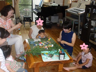 JUGEMテーマ:子育て支援 いつもは とても賑やかなミモザリトミック。 でも今日は ご病気や御用でお休みの方が多かったので 皆さんが寂しい思いをしないように 参加されている方々の個性を生かした プログラムにきゅうきょ 変更してみました。 まずは、女の子ちゃんたちに喜んでもらえるように 七夕づくり。 みんなで、願い事を書いた短冊や 折り紙で飾りを作って 笹の葉へ結びました。 そして リズム楽器や ...