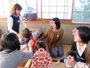 JUGEMテーマ:子育て支援 月に2〜3度の子育て支援活動なので 皆さんにお目にかかるたびに お子さんの様子が 劇的に進化!!しているのを 目の当たりにできる私たちは 本当に幸せです。 今日は 皆さんで クリスマスツリーのペーパークラフトを 作成しました。 みんなでそれを持って 記念撮影! 今日の音楽担当は 直美先生。 ママと一緒に おふねはぎっちらこ と うまはとしとし そして、オーガンジーの布を使って はらはら もみじ狩り! ...
