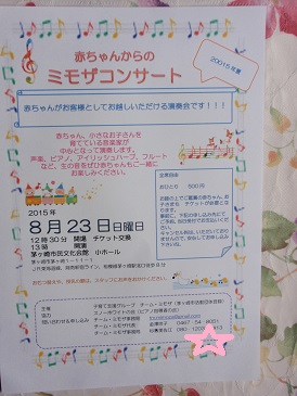 JUGEMテーマ:子育て支援 赤ちゃん 小さなお子さんを育てている 音楽家が中心となって演奏していただき 赤ちゃんがお客様としてお越しいただける ミモザコンサート開催のお知らせです。 時: 2015年8月23日(日) 午後1時開演 途中で休憩15分を含み 午後2時30分までの予定。 所: 茅ヶ崎市文化会館小ホール 入場料: 赤ちゃんも大人もみなさま おひとり500円 授乳やおむつ替えなどのスペースは係りの者がご案内いたします。 ...