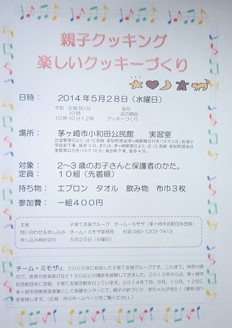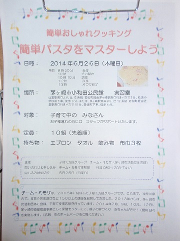 JUGEMテーマ:子育て支援 今日の午前中は ピアノのおけいこが始まるまでの 数時間 子育て支援グループ チーム・ミモザとして まずは、公民館に 6月26日企画のチラシを 届けました。 簡単おしゃれクッキング 簡単パスタをマスターしよう お子様連れでも安心してご参加ください!! 公民館の館長さんも 私たちの活動を応援してくださっているので これまでの リトミックやクッキーづくりの様子を 尋ねてくれます。 また茅...
