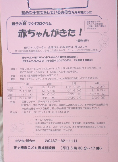 JUGEMテーマ:子育て支援 今年度は、私が主宰している 子育て支援グループチーム・ミモザと 茅ヶ崎市が協働で子育て支援事業を行う事になりました。 茅ヶ崎市は、毎年 新しくママになる方が1000人。 初めて 赤ちゃんを育てるって 楽しみでもあり 不安な気持ちもちょっぴり。 そのような皆さんに寄り添った 子育て支援活動ができるように 準備を進めています。 先日は、チーム・ミモザのお仲間と A3サイズのポスターを作ったので さっそく 市の窓口な...