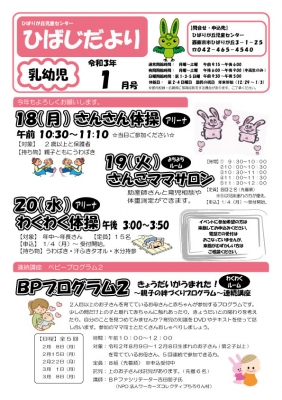 JUGEMテーマ:児童館 ひばじだよりの1月号です。 ※各年代のおたよりをクリックすると拡大表示されます。 児童センターは1月4日(月)〜開館しております。 ー年末年始の休館日は12/29(火)〜1/3(日)です‐ あそびの種類やイベントは、まだ完全に復活していませんが 外が寒すぎる日などぜひ、児童センターに遊びに来てくださいね。 換気もしながら、しっかり暖房を効かせてお待ちしております! 【乳幼児向け】 さんさん体操(2歳児以上)が復活します。 イベ...