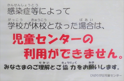 JUGEMテーマ:児童館 ひばりが丘児童センターを利用するにあたって、通学している小学校、中学校、高校が インフルエンザや新型コロナウイルスなど感染症発症などによって『学級閉鎖』や『休校』に なった場合は、児童館の利用はできませんので、ご理解・ご協力をお願いします。 また、児童センターを利用する場合は、『マスク着用』・『手指の消毒』・『距離をあけて過ごす』などの 対策を徹底しています。みんなで使う児童センターをみんなで守ろう!!