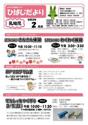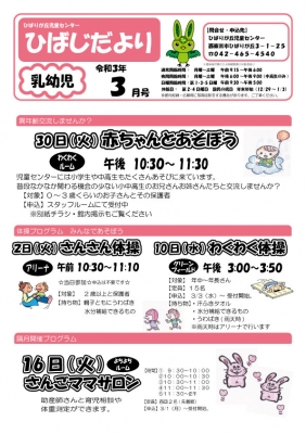 JUGEMテーマ:児童館 みなさん、こんにちは。 2020年度も最後の月となりますね。 今年度最後の『ひばじだより3月号』ができました。 ※各年代のおたよりをクリックすると拡大表示されます。 【乳幼児向け】 ○ただいま『ランチタイム』の利用を中止しています。 再開の場合は、またブログやツィッター、館内掲示にてお知らせ致します。 【小学生向け】 ○『赤ちゃんと遊ぼう』の参加者を募集しています。 希望する人は、スタッフルームにて申し込んでください...