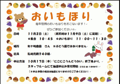 毎年恒例 秋のおいもほりのご案内です。 親子でさつまいもを収穫にいこう! 日時:11月2日(日)※雨天の場合は9日(土)に延期 9日も雨天場合は中止 集合 午前10:45 おいもほり 11:00から11:30 場所:矢ケ崎農園(申込受付時に地図を載せた詳細の用紙をお渡しします) 参加費:無料 定員:乳幼児親子40組 ※申し込み多数の場合は抽選 申込みは児童センタースタッフルームにて受付中です。25日(金)まで受付。 26日(土)午前10時ごろ、当ブログにて...