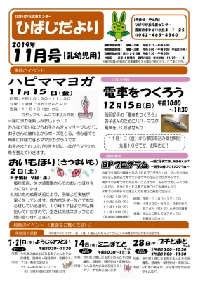 こんにちは! 11月のおたよりです。 ※画像をクリックすると大きい画像で見られます。 乳幼児向け 小学生向け 中高生年代向け ※各イベントの申込はメール・電話等では受け付けておりません。直接ご来館の上お申し込みください。 JUGEMテーマ:児童館