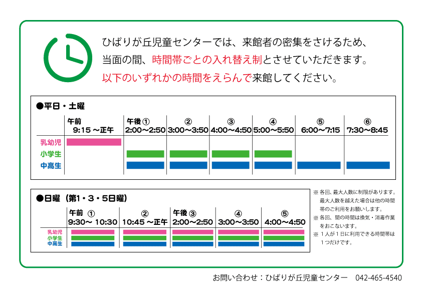 3月26日(木)より児童センターを再開します。 くわしくは西東京市のHPをご確認ください。 http://www.city.nishitokyo.lg.jp/kosodate/zidokan_zidocenter/jidoukansaikai.html なお、春休み期間(令和2年3月26日から4月5日まで)は、利用者ごとに利用時間が決められております。 午前9時15分から12時・・・乳幼児およびその保護者 午後1時から午後6時・・・小学生と中高生 午後6時から午後9時・・・中高生 ※乳幼児の利用は午前のみとなりますのでご注意ください。 また、上...