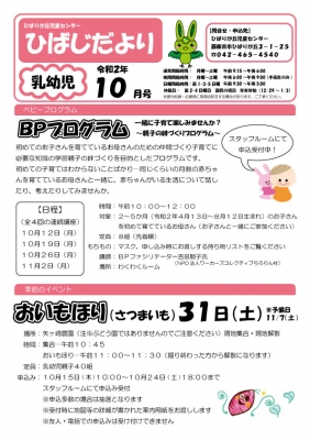 こんにちは! ひばりが丘児童センター10月のおたよりです。 まだまだ感染症拡大防止対策をしたうえでの開館となっておりますが、 少しずつイベントを再開しております。 現在のところ、原則事前申込制となっておりますので何卒ご協力をお願いいたします。 各イベント、申込みの日時をご確認の上お申込みください。 【乳幼児向けおたより】※クリックすると大きい画像が開きます 【小学生向けおたより】 【中高生向けおたより】...