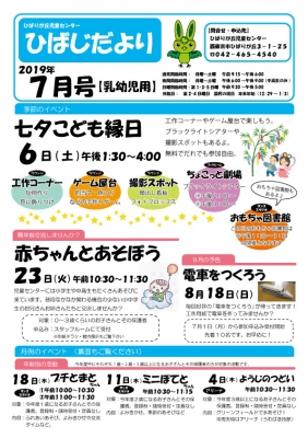 こんにちは! 7月のおたよりです。 ※画像をクリックすると大きい画像が見られます。 乳幼児向け 小学生向け 中高生年代向け ※各イベントの申込はメール・電話等では受け付けておりません。直接ご来館の上お申し込みください。 JUGEMテーマ:児童館