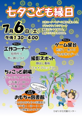7月6日(土) 七夕こども縁日 午後1:30〜4:00 ※クリックで大きい画像が見られます。 【内容】 ・工作コーナー 短冊&笹飾り作り 地域の方から頂いた本物の竹&笹に飾り付けよう ・ゲーム屋台 新聞紙ダーツやおさかなつりであそぼう ・ちょこっと劇場 七夕のブラックライトシアター 1回目2:00〜 2回目3:00〜 ・撮影スポット 顔出し看板やフォトプロップスで写真映え! ・おもちゃ図書館 この日のおも...