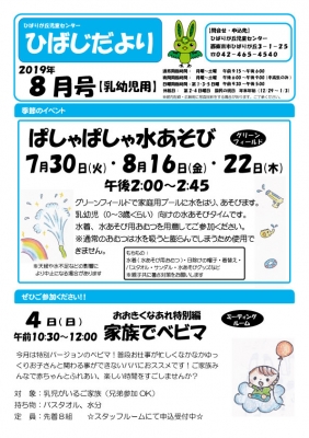こんにちは! じとじとと雨ばかりで鬱陶しい日が続きましたが今週からは一気に暑くなって夏らしくなるみたいですね。 児童センターは夏休みに入って毎日たくさんの子ども達でにぎわっています。 8月のおたよりです (クリックすると大きな画像が見られます) 乳幼児向け 小学生向け 中高生向け 水あそびやお泊りキャンプなど夏休みならではのイベントがたのしみですね。 ...