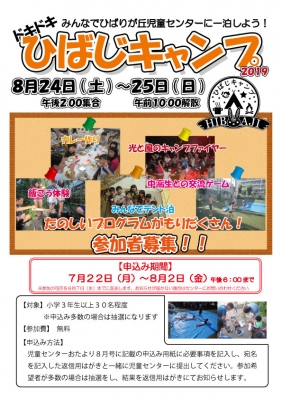 小学生のみなさん児童センターに一泊しよう! 毎年恒例のお泊りキャンプ、追加申込み10名を募集します! カレー作りや飯ごう体験 「火を使わない」光と風の疑似キャンプファイヤー 夜間開館の中高生たちとの交流タイム いつもあそんでいるアリーナでテント泊 仲間たちと夏休みのステキな思い出をつくろう! 対象:小学校3年生以上 6年生まで ※夜間の中高校生との交流タイムは中高生も参加できます 日時:令和元年8月24日(土)午後2時 から 2...
