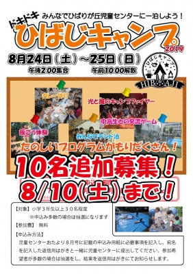毎年恒例、夏休みのお泊り行事 今年は「ひばじキャンプ」と名称を変えて実施します 普段あそんでいる児童センターに一泊しよう! カレー作りや飯ごう体験 「火を使わない」光と風の疑似キャンプファイヤー 夜間開館の中高生たちとの交流タイム いつもあそんでいるアリーナでテント泊 仲間たちと夏休みのステキな思い出をつくろう! 対象:小学校3年生以上 6年生まで ※夜間の中高校生との交流タイムは中高生も参加できます 日...