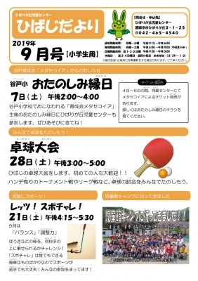 もうすぐ夏休みも終わりですね。 楽しい夏休みを過ごせたでしょうか。 9月のおたよりです。 小学生向け 乳幼児向け 中高生向け 各イベントについての詳細は児童センターにお問い合わせください。 JUGEMテーマ:児童館