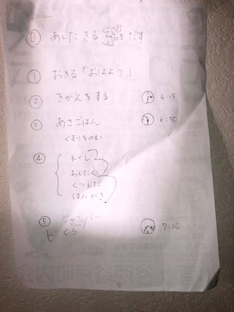 子育て家庭の多くは、朝の時間が大忙しでしょう。 朝早く起こしても、なかなか着替えないとか、ご飯をゆっくり食べて片付かないとか、、、。 ゆっくりさねちゃんも、自分のことは自分でやりますが、いかんせん速度が。 お母さんが、順番を書いて、リビングに貼ってくれました。 先週1週間は、それを見ながら熱心に準備していました。 速度が変わるかというと・・・ですが、それでも言われる前に自分から行動する方が気持ちよいのは確かなようです。 それにしても 「ねぇ、あしたきるを...