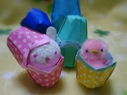 JUGEMテーマ:クラフト・手芸 色々 JUGEMテーマ:子供の遊び・創造性 作り方の前にサイズです。 写真のサイズがバラバラね(^^; 右の写真の白いのが本物の卵 M〜Lサイズくらい。 ・ピンクと黄色のが、15cm×15cm の折り紙を裏表に2枚。 ・ピンクの花柄とピンクのが、7.5cm×7.5cm のを裏表に2枚。 ・水色一色のが、15cm×15cmのを1枚 で作ってます。 裏表で2枚を使う作り方 画像をクリックして拡大 1〜4は鶴の折り方の最初と同じだけど ずれにくいので、この↑折り方で折ってみ...